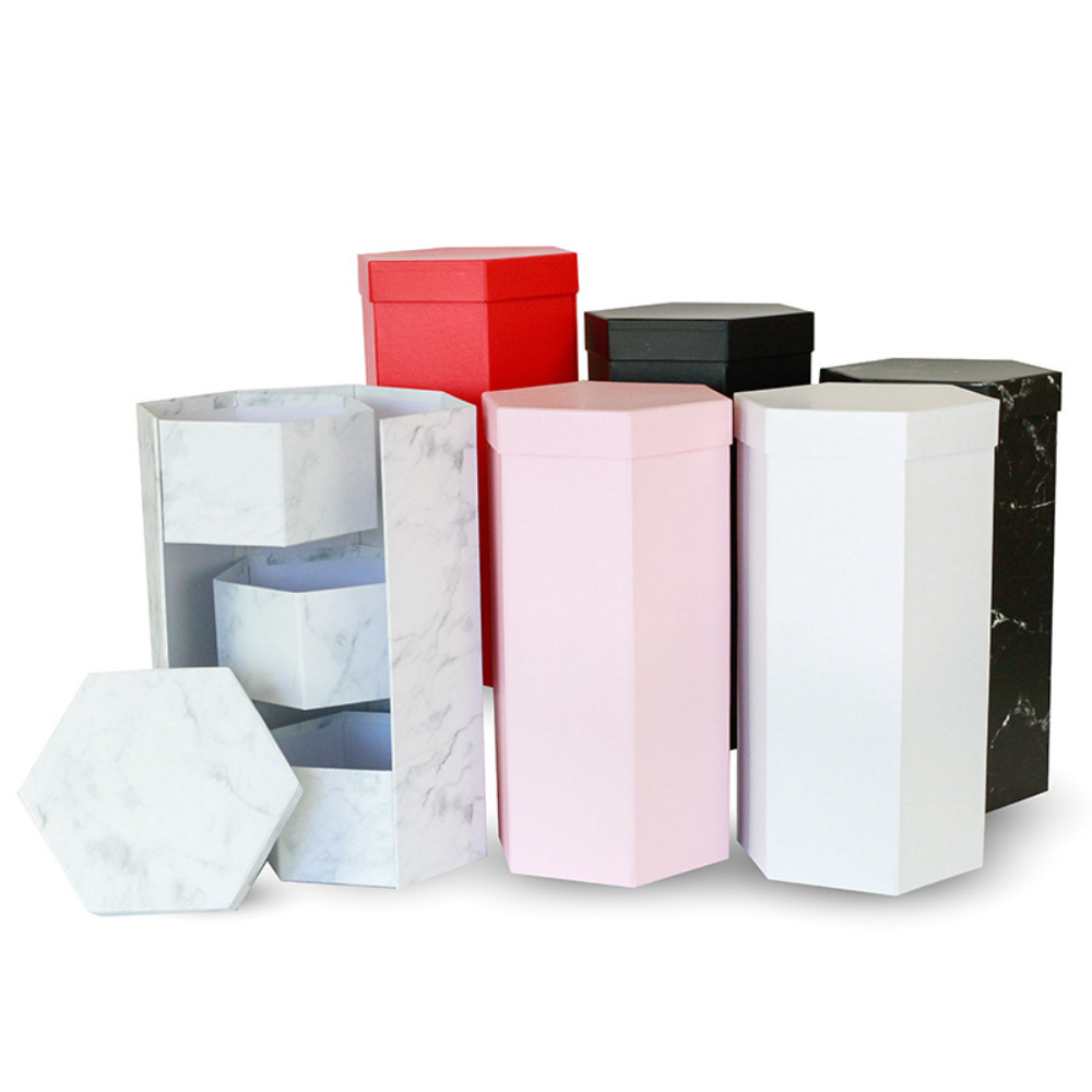 - Premium Quality Hexagon Shape Surprise Floral Gift Box 3 Tier, White Marble